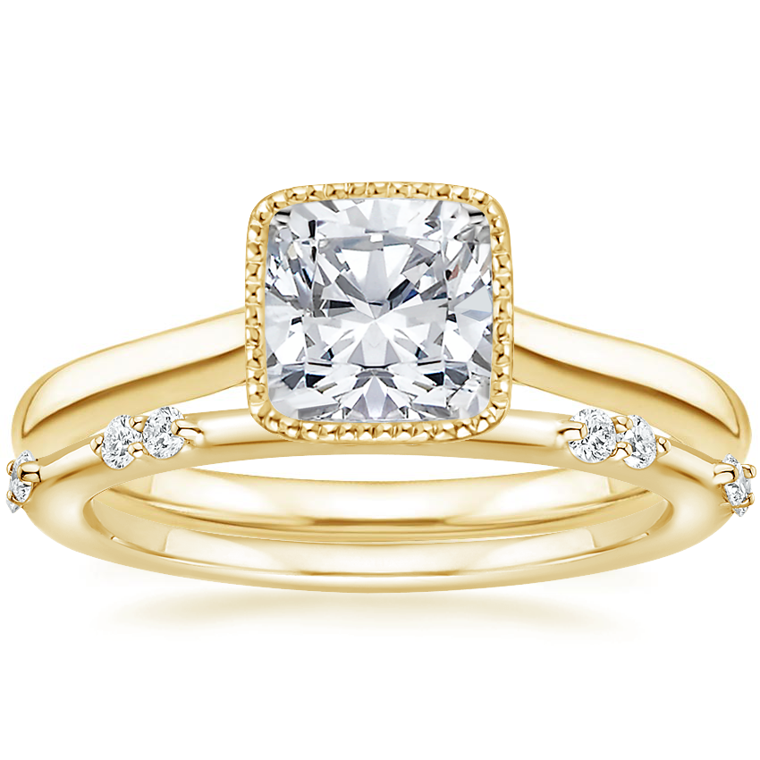 I chose this ring as my engagement ring because it's so special! The milgrain gives the ring such a vintage look. I love the clean look of the band. I had it customized to 14k yellow gold because I prefer the color a bit more. My ring is set with an 8mm round moissanite.