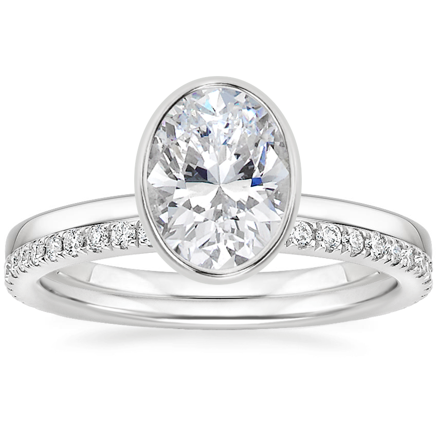 I was specifically looking for a bezel set ring because prongs get caught on things is a pet peeve and I wanted my diamond absolutely secure. This setting gave me the bezel with a simple yet elegant gallery that is very similar to a classic gallery because the sides of the diamond are still exposed! I get a stunning view of my diamond while also having a bezel set that keeps it secure and from catching on clothing! Another plus with this design is that the diamond sits high (it may seem too high at first but you get used to it) and therefore, your wedding band will mostly likely sit flush (depending on which band you choose). I chose a channeled double row pave from another maker and the way it pairs with this E-ring is perfection and everything I wanted. For reference my diamond specs are: 0.95ct Oval, E, VVS1. It sparkles beautifully :)