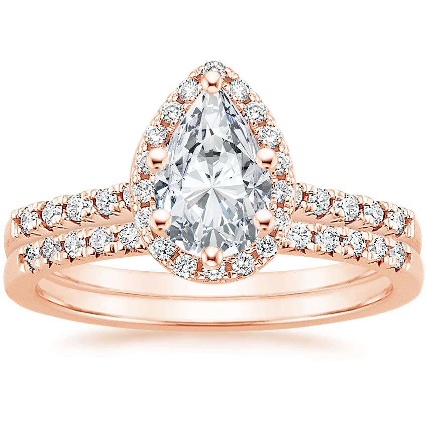 An intricate halo of pavé-set diamonds embraces and accentuates the center gem in this stunning bridal set. French pavé diamond accents on the band and matching wedding ring add a truly dazzling effect. ... Read More