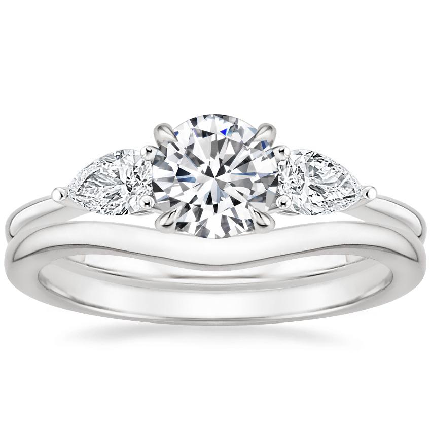18K White Gold Opera Diamond Ring with Petite Curved Wedding Ring