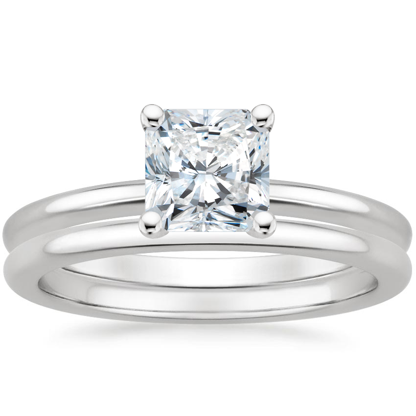This elegant solitaire bridal set features a raised gallery that allows the wedding band to sit flush for a perfect fit. The petite bands add to the sleek, classic look of this ring. ... Read More