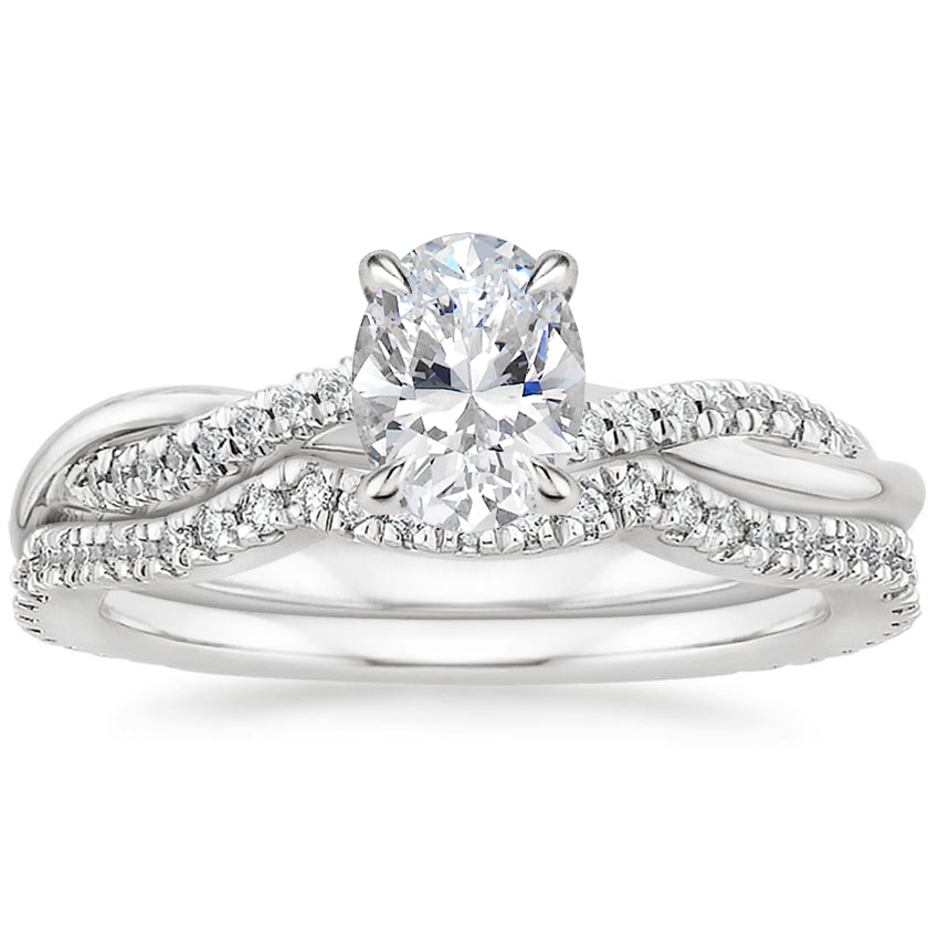 Ribbons of pavé-set diamonds and high polished precious metal weave together in this nature-inspired design. A diamond embellished wedding band contours to the engagement ring for a perfect fit. ... Read More