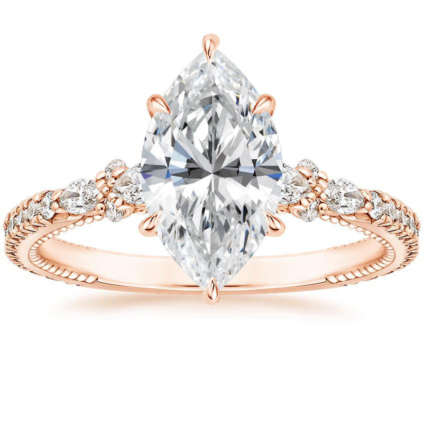 My fiancé knocked it out of the park. I had sent this setting to him as an option, not knowing he had already picked it out. Ring is rose gold, 5.25 ring size with a 1.5 caret round diamond. I love the marquise petal clusters around the main stone, and the curved elongated basket prongs. Thinking of pairing it with a simple gold band so as to not detract from its many beautiful details.