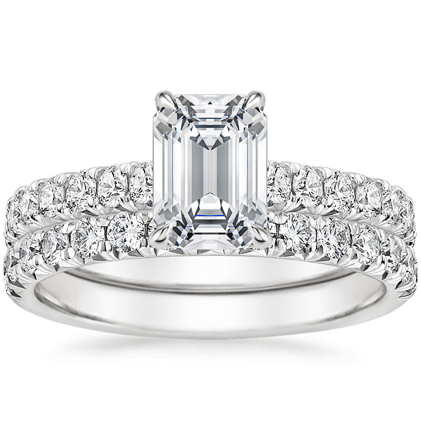 This glamorous ring features sleek claw prongs around the center gem, and shimmering French pavé-set diamonds along the band. The matching wedding band sparkles with French pavé diamonds, a style of setting that maximizes brilliance. ... Read More