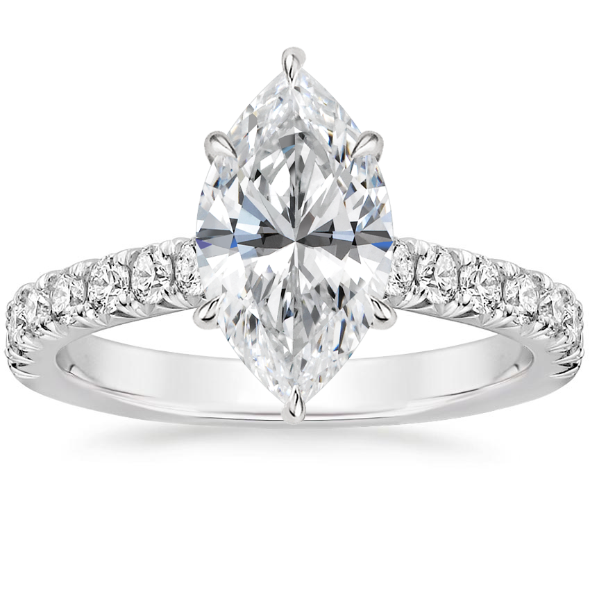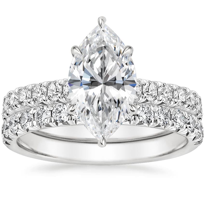 This glamorous ring features sleek claw prongs around the center gem, and shimmering French pavé-set diamonds along the band. The matching wedding band sparkles with French pavé diamonds, a style of setting that maximizes brilliance. ... Read More