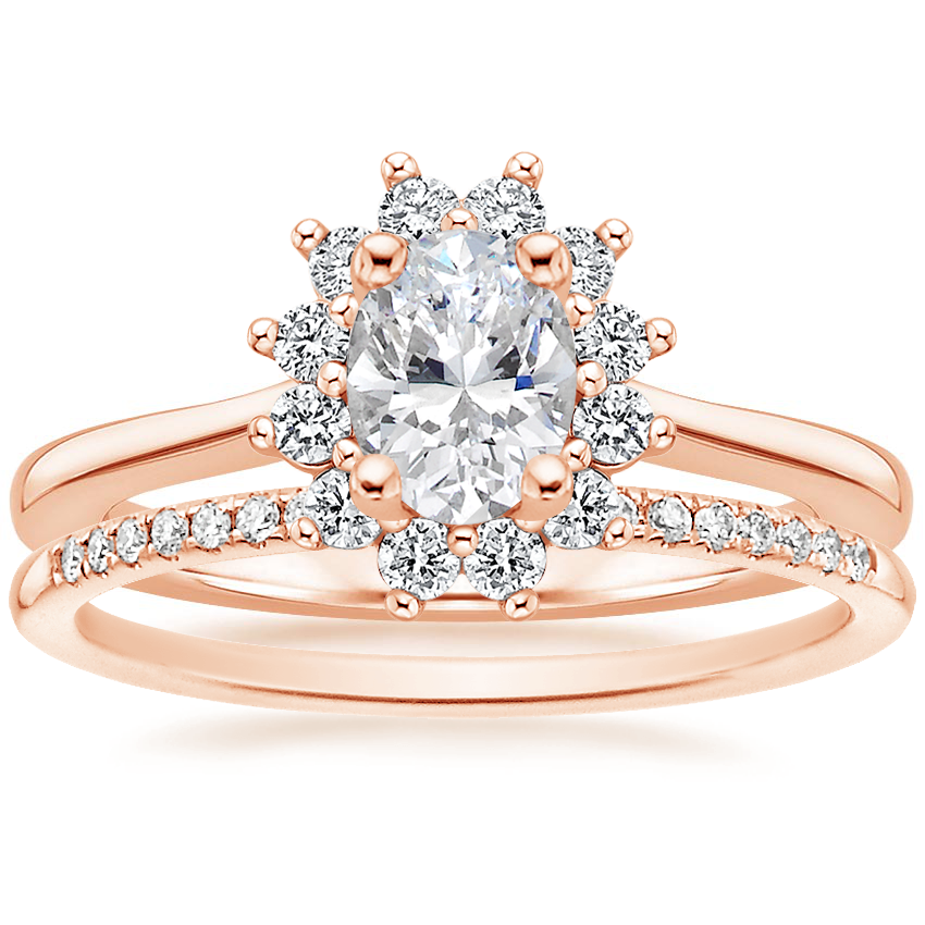 My husband proposed to me with the oval sunburst halo ring and we chose a gold wedding band together at the Brilliant Earth in Chicago. I am in love with it even a year later! I get so many compliments!
