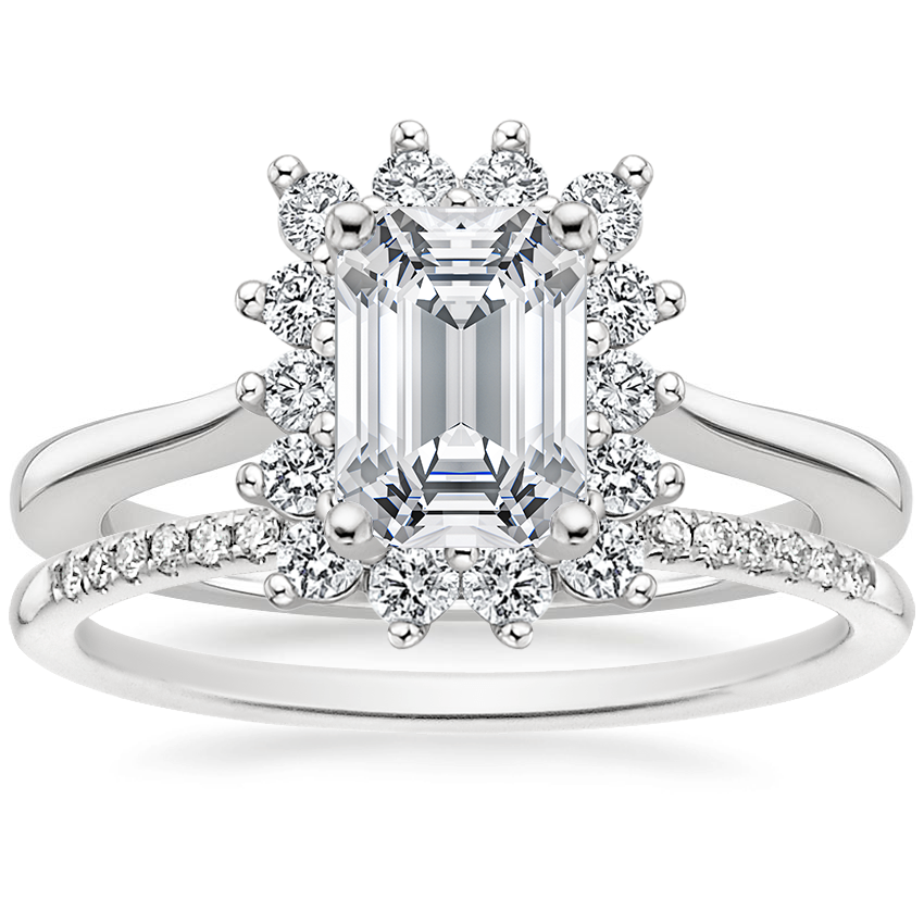 My husband proposed to me with the oval sunburst halo ring and we chose a gold wedding band together at the Brilliant Earth in Chicago. I am in love with it even a year later! I get so many compliments!