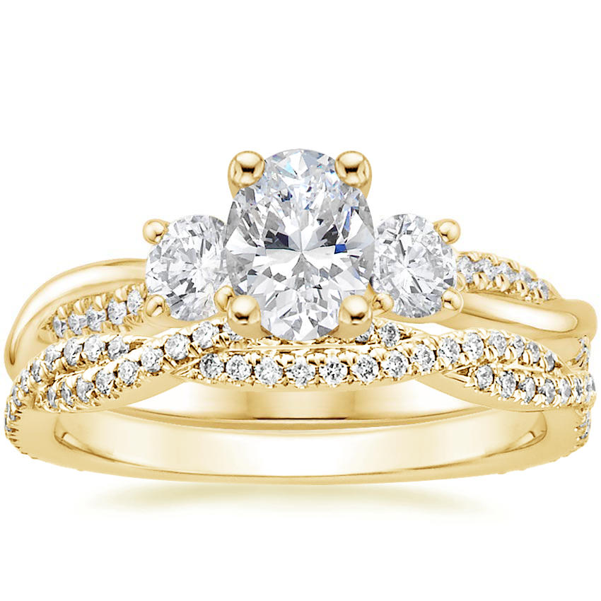 18K Yellow Gold Three Stone Petite Twisted Vine Diamond Ring with Petite Luxe Twisted Vine Diamond Ring