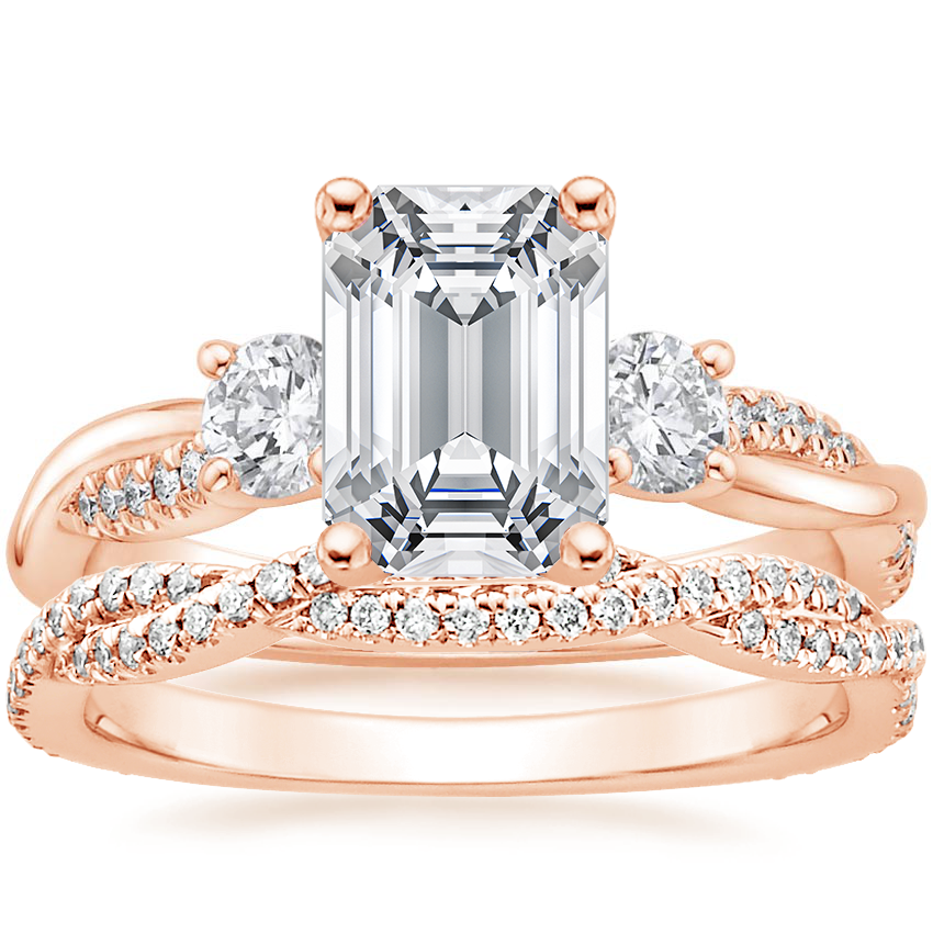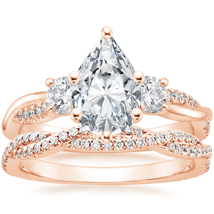 14K Rose Gold Three Stone Petite Twisted Vine Diamond Ring with Petite Luxe Twisted Vine Diamond Ring