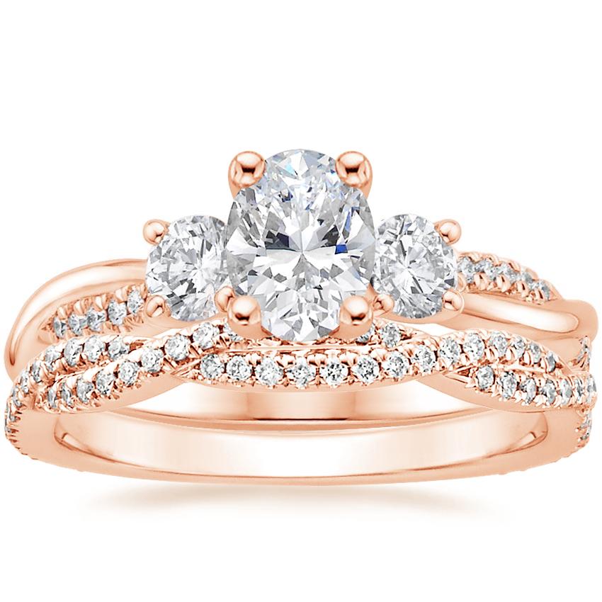 14K Rose Gold Three Stone Petite Twisted Vine Diamond Ring with Petite Luxe Twisted Vine Diamond Ring